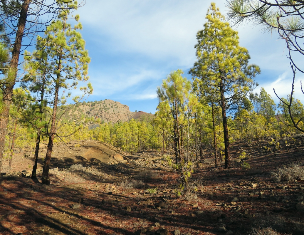 From our campsite in the tunnel we climbed 200 meters to Portillo through the green pine forest. On the top we were greeted by the spectacular Teide volcano rising against the background of a clear blue sky. Soft morning sunshine painted its slopes in gold. We enjoyed the view while we walked towards the border of the National park.
